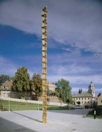 Nicht weit entfernt befinden sich zwei wie beiseite gelegte rostende Säulenfragmente, die, wie Vanitashinweise, auf ironische Weise den Glanz und die Pracht der goldenen Säule relativieren.